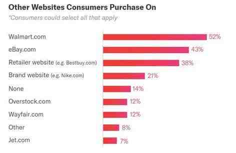 而在亚马逊的主要竞争对手中,只有沃尔玛(Walmart)和易贝(eBay)能对亚马逊的霸主地位产生一些威胁,有52%的被调查者表示曾经使用过Walmart进行购物,而曾经使用过eBay有43%。