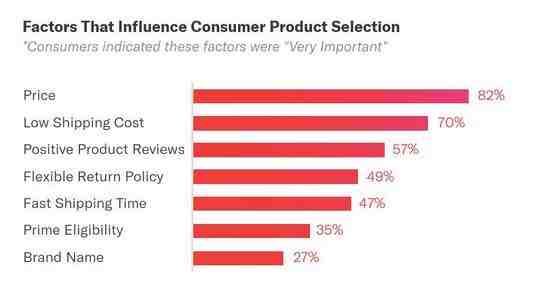 在影响顾客做出购买选择的因素中,价格price因素依然占据了榜首的位置,但是这里的价格是指在亚马逊上的产品价格,而不是将亚马逊上同类产品的价格和ebay等平台进行比较,亚马逊走的是精品路线,如果单纯比较价格的话,亚马逊和沃尔玛、ebay相比不占任何优势。第二大影响因素是运费价格的高低,第三大影响因素是好评的数量和质量。有了这一点调查结果,广大的卖家就知道该从什么方向提升自己listing的竞争力了吧。