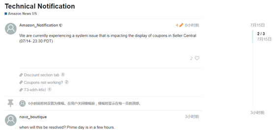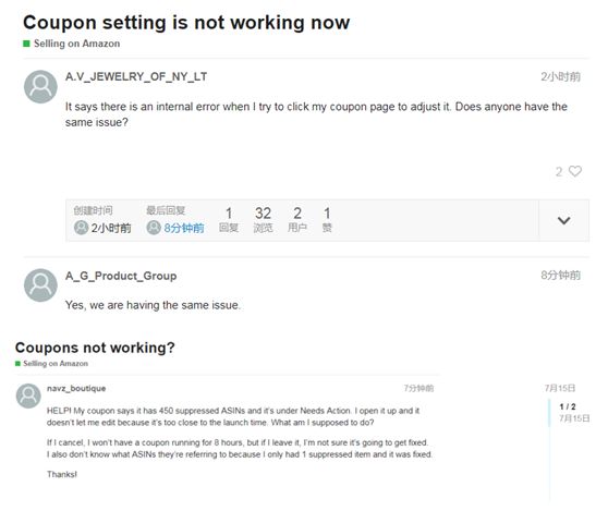亚马逊coupons(优惠券)页面出错 15日一早,有很多卖家在亚马逊卖家论坛反馈求助,准备调整coupons时,发现coupons设置页面突然出现技术错误提示,无法正常访问。 (图源亚马逊卖家论坛) 不少中国卖家也出现了同样的问题,有卖家表示,coupons设置页面已经进不去,还有几十个coupons未来得及取消,如果这些coupons不能在Prime Day开始前取消,将会影响Prime Day期间的销售,会造成很大的损失。 船长了解到,据卖家反馈的消息,Coupons设置页面显示“The website is having a technical problem,please try again(网站遇到一个技术问题,请再试一次)”。 (图源Coupons设置页面错误提示截图) 据悉,有卖家开case联系了卖家支持,得到的回复竟然是修复的时间暂时没有通知,建议卖家多尝试几次,这种问题一般会在24小时内进行修复的。 (图源客服的回复截图) 这么大的问题,客服居然给出了这么模棱两可的回复,实在是让人脑阔疼。不过,截止船长发文前,有很多卖家表示,Coupons设置页面已经可以访问了,不过还是有部分卖家称,问题依旧! 此外,亚马逊也发布了通知,告知卖家亚马逊coupons页面遇到了系统技术问题,影响了卖家中心的Coupons显示。 (图源亚马逊卖家论坛) 亚马逊系统间歇性抽风已经不是一天两天的事情了,但这对于平台的卖家而言影响还是不小的,特别是在Prime Day大促这个时间点,很多卖家报了秒杀,设置了折扣,如果出现coupons加上Prime Day的双重折扣优惠,肯定是要赔钱的。 亚马逊产品价格显示错误 不得不说,现在亚马逊的网站确实有点混乱,今早有卖家还发现在亚马逊 “Today's Deals(今日特卖)”栏目中的Fire TV Stick和Fire TV Stick 4K产品的交易价格分别为14.99美元和24.99美元,但是在对应listing中看到的又是全价。 (图源亚马逊) 由于亚马逊的一个小故障,可以在购物车中以两种不同的价格购买相同的商品。好在没多久,亚马逊就修复了此问题。 活动期间商品无法添加购物车(出现短暂时间) 有买家在推特上抱怨他们在亚马逊Prime Day 2019活动期间出现短暂无法将商品添加到购物车的情况。 (图源推特) 买家表示,很想在Prime Day购买商品,但总是会收到一个“FAILED TO ADD TO CART(添加购物车失败)”的错误,重试了好多次,都失败了。该问题在出现数小时后得到了解决。 相信做亚马逊的卖家都了解,亚马逊系统的bug非常多,面对这些问题,不要干着急,船长建议最好第一时间先联系客服询问原因和解决方案,这样解决问题的效率会相对高些。