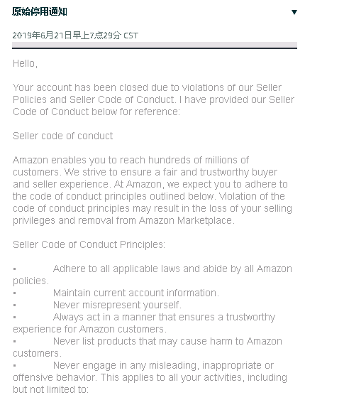这封亚马逊发给被跟卖卖家的邮件,写的是违反了“Code of Conduct”,其实这封邮件写的非常笼统,你完全看不出到底违反了什么政策,后面我们帮这个卖家分析了很久,最后才找到原因,是因为这个卖家用大量买家号下单赶跟卖,这个异常的下单行为被亚马逊捕捉到了,被一个亚马逊的经理反馈到上一级别的团队去审核。