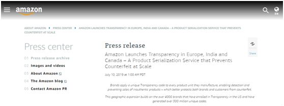 亚马逊透明计划全面升级 当然,亚马逊在优化打假服务方面还在不断的完善中。船长获悉,亚马逊于昨日(2019年7月10日)宣布全面升级Amazon Transparency(亚马逊透明计划),该计划将扩展到法国、德国、意大利、西班牙、英国、印度和加拿大。通过该计划,品牌将独特的透明代码应用到他们生产的每一个产品单元,从而能够检测和防止假冒产品的销售。 (图源:Amazon blog) 此举是基于亚马逊在美国现有的透明计划服务。目前,亚马逊在美国拥有4000多个品牌使用该计划服务打击假货。这些品牌已经产生了超过3亿个独特的代码,这使得亚马逊能够主动阻止超过25万个仿冒使用透明计划的产品到达客户手中。 据外媒报道,在2019年,对于完全加入透明计划服务的产品,没有出现关于在亚马逊上购买这些产品的品牌或客户的假冒报告。 亚马逊客户信任与合作伙伴支持副总裁Dharmesh Mehta(达哈·梅塔)表示: 无论是线上还是线下,造假都是全行业关注的问题。我们发现,预防假货最有效的解决方案是建立在伙伴关系的基础上,将亚马逊的技术创新与品牌的成熟知识和能力结合起来。我们建立了透明计划,为品牌提供一个简单、可扩展的解决方案,使品牌和亚马逊能够在供应链内对产品进行认证,在假货到达客户之前阻止它们。 透明计划对卖家的驱动作用 1、关于什么是亚马逊透明计划 相信很多卖家都应该有了解过。它为生产的每个单元提供唯一的代码。各大品牌在其产品上都贴上了这些代码,每次在亚马逊订购这些产品时,亚马逊都会扫描并验证代码,以确保只有正品才能到达消费者手中。 (图源transparency官网) 此外,消费者可以使用亚马逊购物APP或Transparency APP为其iOS或Android手机扫描产品上的扫描代码并验证真伪。扫描时,如果代码有效, APP将显示绿色复选标记,否则显示红色X标记。品牌可以选择共享其他单位级别的产品信息,例如生产日期,生产地点和增强的产品信息(例如成分)。 PS:Transparency APP目前仅在美国提供。 2、关于卖家注册使用透明计划的前提条件 首先,能够验证自己是产品的品牌所有者(需要进行品牌升级,完成品牌备案2.0); 其次,必须在销售国注册商标,并拥有R标; 再有,全球贸易项目编号(GTIN),如产品上的UPC或EAN条形码; 最后,能够在他们制造的每个单元上应用唯一的透明计划代码。 (图源transparency官网) 亚马逊透明计划注册地址: https://brandservices.amazon.com/transparency?ref=TRUSLPR 3、关于使用亚马逊透明计划所需要的费用 主要是亚马逊提供的标签费用:小于100万个,每个0.05美元;100万—1000万个,每个0.03美元;大于1000万个,每个0.01美元。 如果卖家想消除自己身边的一些假货产品的竞争,或者赶走跟卖,可以考虑使用透明计划。但是需要注意会增加人工成本和产品成本,最好结合自己店铺运营的实际情况来做抉择。