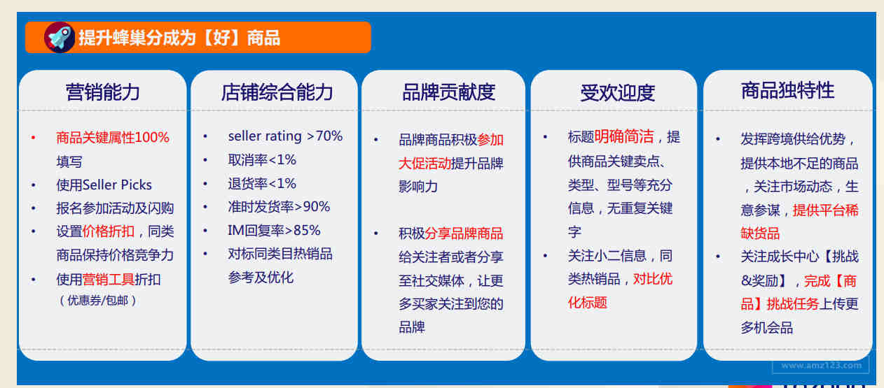 蜂巢分是算法根据以下五边形维度及子项计分得出,每个维度的计分权重由算法决定,营销能力和店铺综合能力相对较高。