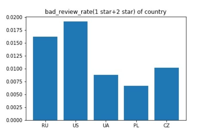 前面分析到,该行业好评率高,因此差评率也普遍较低。买家占比排名前五的国家中,美国差评率最高,为1.91%,高于行业平均差评率1.16%。另外,排名第一的俄罗斯差评率为1.62%。波兰(0.66%)、乌克兰(0.88%)、捷克(1.02%)差评率皆低于平均水平。卖家可以综合参考这些数据合理选择国家进行重点营销。