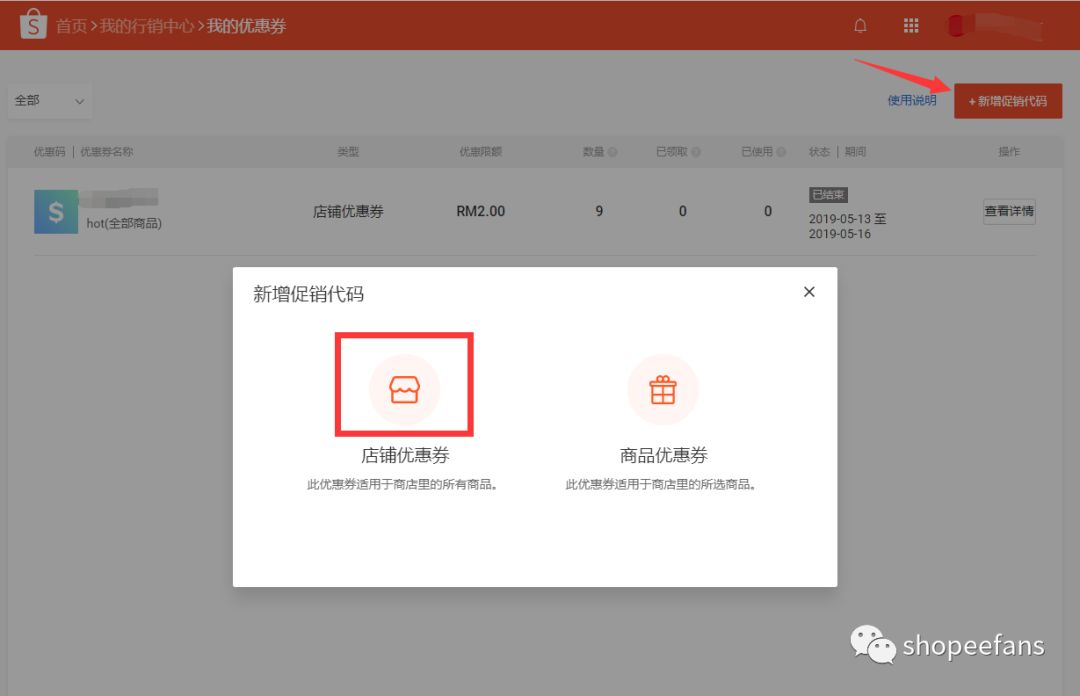 登陆"卖家中心"-"我的行销活动"-"我的优惠券"-"新增促销代码"-"店铺优惠券"