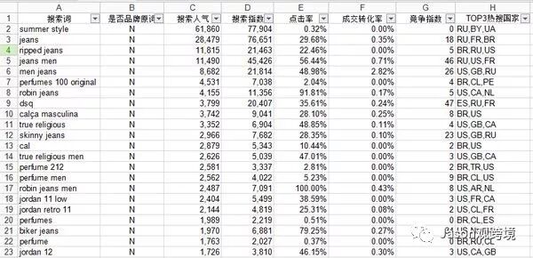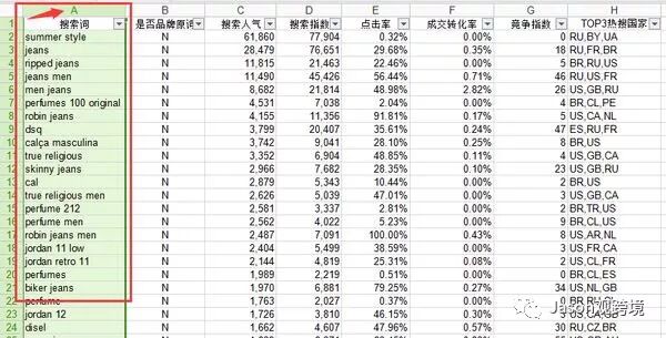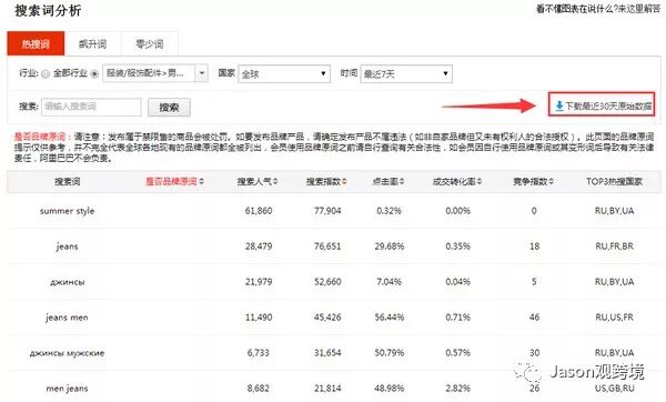 在搜索词分析中可以下载最近30天的关键词数据,下载过后就是一个表格了,如下图所示。