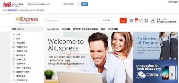 上图是速卖通买家首页,如果看不懂直接打开一个翻译工具来翻译整个网页,这里我们就拿有道翻译演示吧,如下图所示。
