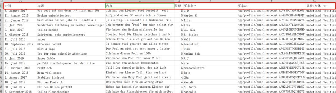 通过插件将这款游泳圈的Review下载,下载后Review的信息体现在表格上,重点的Review内容肯定是有的,还有星级和标题,时间等等信息。如果只看5星就对表格进行编辑即可,方便简单!