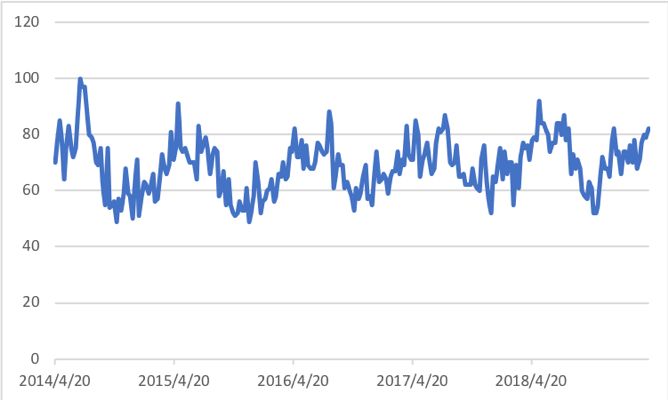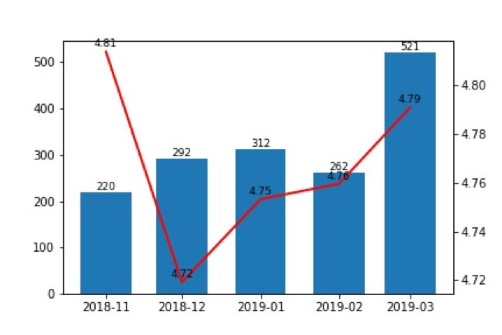 再看平均星级数,该样品市场的平均星级数在4.77左右波动。其中,2018年11月的平均星级数最高为4.81,可一个月后即12月的平均星级数跌至最低为4.72,之后的平均星级数逐渐爬升。
