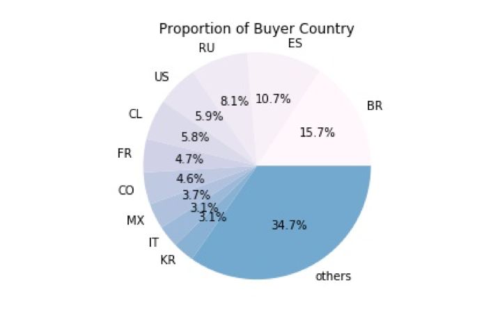 本期微分析(weanaly.com)速卖通市场行情速览选择的类目是运动类目,关键词是cycling shoes,匹配搜索结果11116条。由于速卖通仅显示前100页商品,因此该关键词下有43.18%的商品可得到展示; -行业好评率较低 样品市场中共有五星好评1789条,四星好评243条,三星中评44条,二星差评18条以及一星差评35条。该样品市场的总体好评率为95.44% (五星+四星),差评率为2.49% (二星+一星)。可见行业好评率较低。 —BR、CL值得关注 该行业中,巴西(15.74%)、西班牙(10.67%)和俄罗斯(8.13%)的买家占比分别排前三。除此之外排名第四的美国以及排名第五的智利也有不少市场份额,占比为5.87%、5.78%。巴西和智利两个市场颇有发展潜力,值得关注。 —美国差评率为零 从差评率的角度看:买家占比排名前五的国家中,西班牙的差评率最高为2.64%。排名第二的巴西差评率为2.09%,第三的俄罗斯差评率为1.16%,第五的智利为1.63% 。占有不少市场份额的美国差评率为0,市场前景十分可观,卖家可进行重点营销。