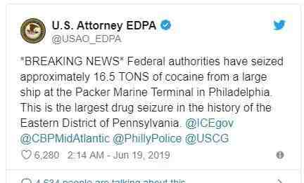据美国检察官办公室称,从7个集装箱中没收了16.5吨可卡因,使其成为宾夕法尼亚州东区历史上最大的毒品缉获量。