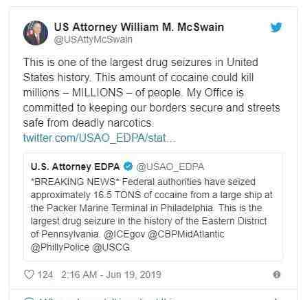 “这是美国历史上最大的毒品缉获量之一。可卡因的数量可能会导致数百万人死亡,“美国检查官McSwain发推文说。