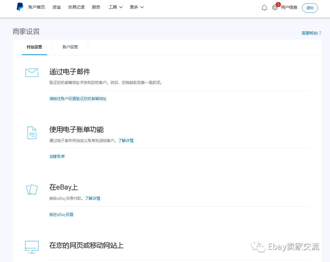 在【商家设置】中,有【付款设置】和【账户设置】两大类。