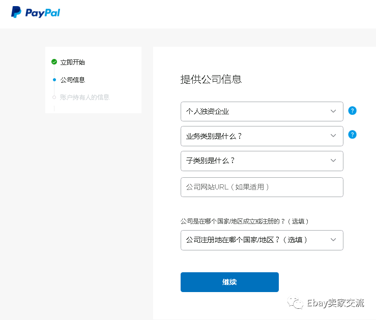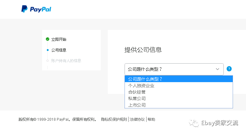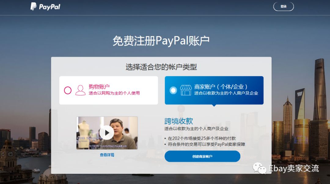 第一步,登陆www.paypal.com,点击注册,选择【商家账号(个体/企业)】
