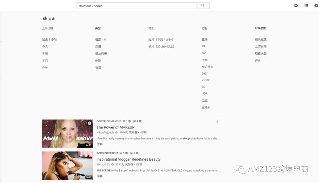 YouTube的搜索结果跟谷歌不一样,你需要搜索视频和频道。例如,在YouTube输入makeup bloggers,然后过滤选项(video、channel)进行搜索,再点击观看次数,查找那些数量在上万至十多万的视频和频道: