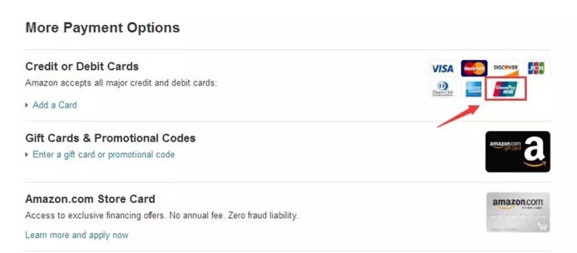 国内信用卡主要分为国际信用卡(VISA、Master、AMEX、JCB等)和银联卡。国际信用卡基本上可以使用大家是知道的,但是大家不要忽略了一点,银联卡也是可以直接使用的哦!大家可以看下图,首先亚马逊是接受银联卡支付的,我们测试过很多次,可以直接购买成功: