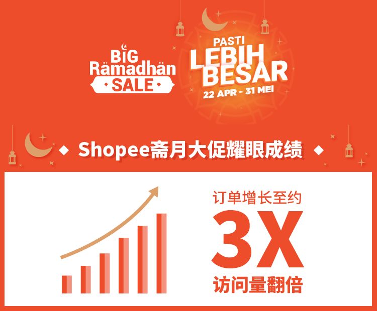 Shopee持续保持强劲增长势头,今年Shopee斋月大促席卷整个印尼,平台订单量较去年斋月峰值期间增长至约3倍,涨势迅猛!此次活动大大满足了当地消费者在斋月和开斋节前的消费需求,大促期间Shopee App更是创下访问量翻倍的纪录!