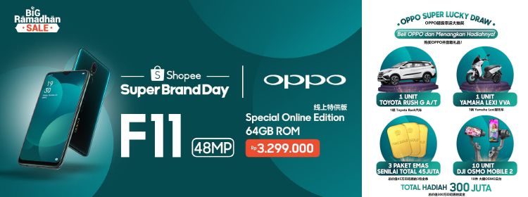 斋月期间,Shopee还与一众品牌强强联合,打造最强大促。OPPO在Shopee印尼举行Super Brand Day,并特别推出Shopee独家F11线上特供版。除了买手机有优惠外,Shopee还赠送全年0网费套餐和超级Toyota Rush汽车等大奖等买家来赢取!引发印尼抢购热潮!