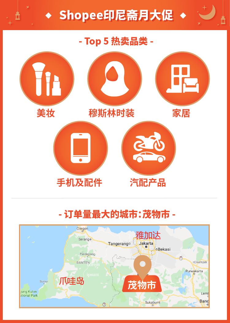 斋月大促期间,Shopee销量最高的五大类目分别是美妆、穆斯林时装、家居、手机及配件、汽配产品。其中,汽配这一品类值得特别关注,我们发现越来越多的消费者转向Shopee寻找汽配产品。此外,Shopee斋月大促期间订单量最大的城市是印度尼西亚第三大城市——茂物市(Bogor City)。