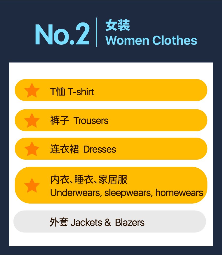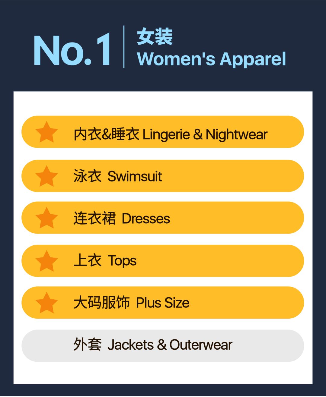 连衣裙是该品类市场最热销子类目,卖家朋友们可上新更多性价比高的潮流新款。裤子方面跨境卖家具有款式优势,尤其是卡其裤颇受欢迎,同时可上新更多牛仔裤。内衣、睡衣、家居服方面,买家更偏爱轻薄款,同时卖家可精选性价比高的商品,提升价格优势。