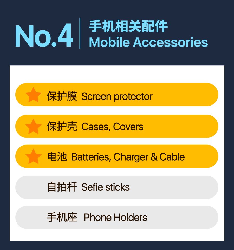 保护膜、保护壳、电池和手机座在跨境卖家SKU中占比高,可搭配合适的Paid Ads和低价促销提升单量。自拍杆是潜力子类目,卖家可多留意多上新。