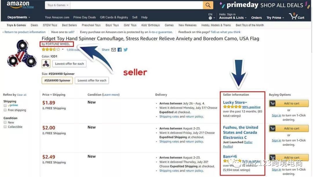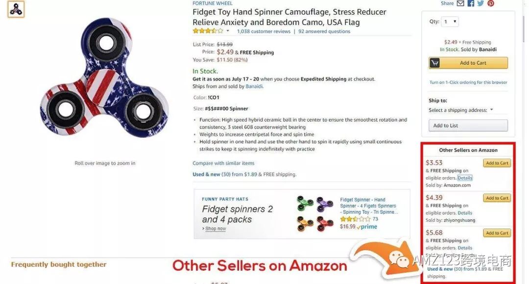 假设你销售指尖陀螺,并且你有一个以自己的品牌创造和制造的产品。有一天,你正好查看你的listing并发现还有其他卖家也在销售。你会看到如下情况: