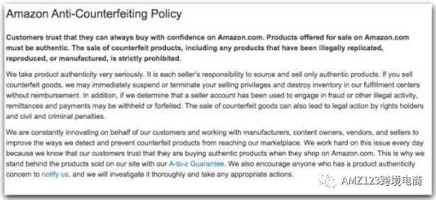 亚马逊有严格的防伪政策,你可以在卖家后台帮助文件中找到。该政策清楚地表明亚马逊对平台上的假货零容忍。