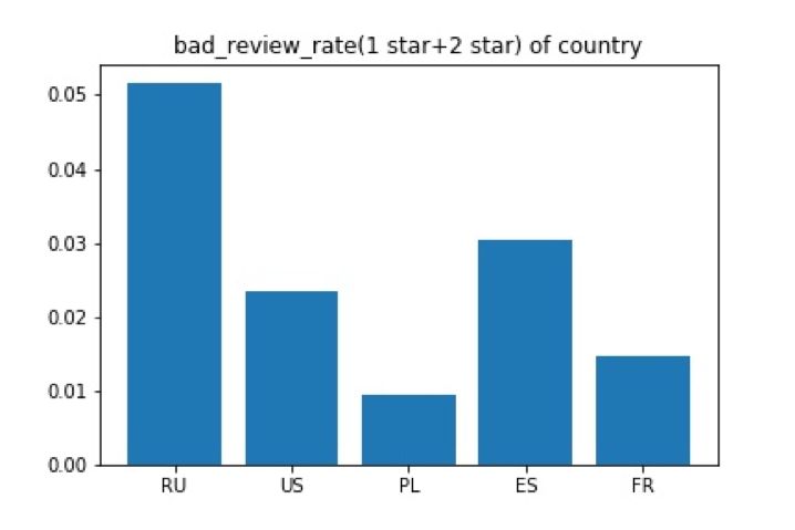 从差评率的角度看:买家占比排名前五的国家中,波兰差评率最低,为0.95% 。其次俄罗斯的差评率最高为5.16%。买家排名第二的美国为2.34% ,第四的西班牙差评率为3.05%,而第五的法国差评率为1.48%。综合来看,波兰拥有高市场份额和低差评率,可见波兰市场大有可为,卖家可以进行重点营销。