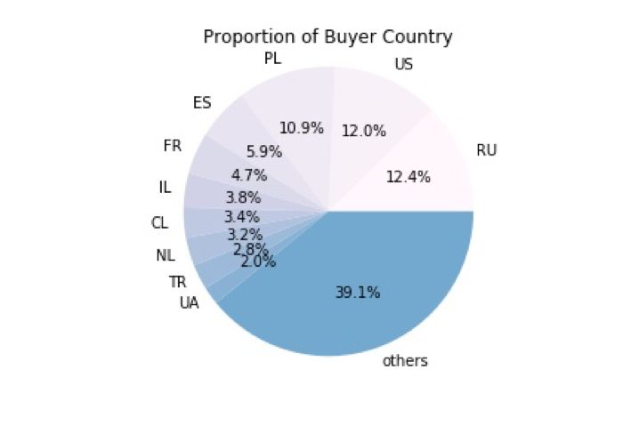 该行业中速卖通消费大国:俄罗斯(12.36%)、美国(11.95%)和波兰(10.92%)的买家占比差异不大,位列前三。除此之外排名第四的西班牙以及排名第五的法国占比分别为5.86%、4.66%。RU、US、PL占有不少市场份额,卖家可以针对这三个国家进行差异化营销,设计相应语言的海报、具有国家特色的文案等,增强品牌好感,进一步扩充市场。