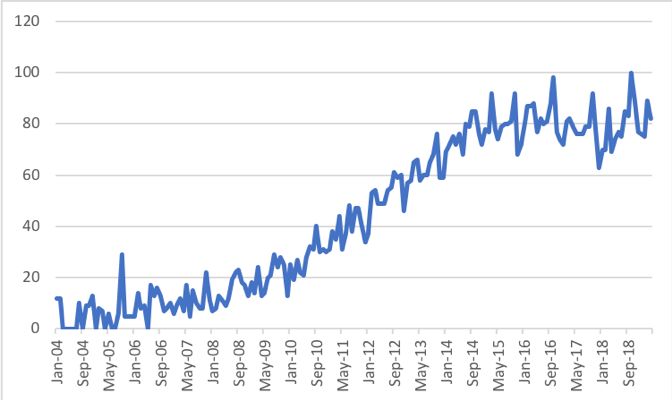 在谷歌趋势中输入baby headband 。从图中可以看出从2004年开始该关键词的搜索热度逐渐飙升。随着该产品全球市场逐步扩大,卖家要做好竞争准备,要打造自身竞争优势,积极争取市场机会,及时进行营销推广。