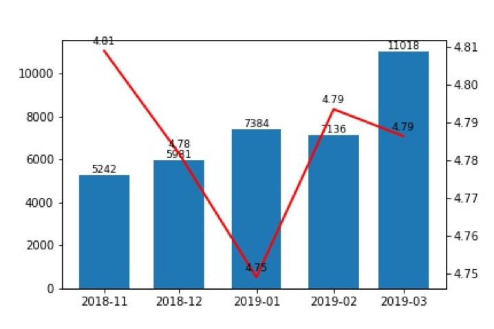 再看平均星级数,该样品市场的平均星级数波动较大。其中,2018年11月的平均星级数最高,为4.81。2019年1月的平均星级数最低,为4.75。
