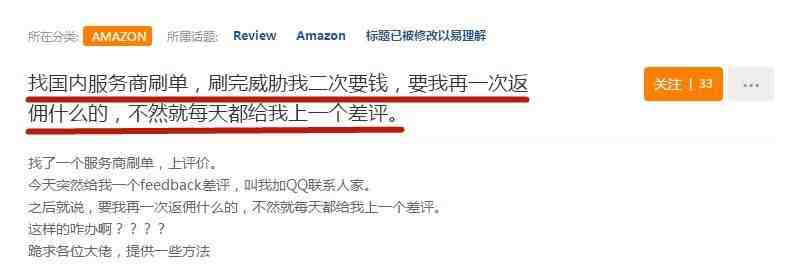 小编在论坛上看到有一位卖家说自己遇到一个刷单的骗子,这位卖家称:“找国内服务商刷单,刷完威胁我二次要钱,要我再一次返佣什么的,不然就每天都给我上一个差评。”