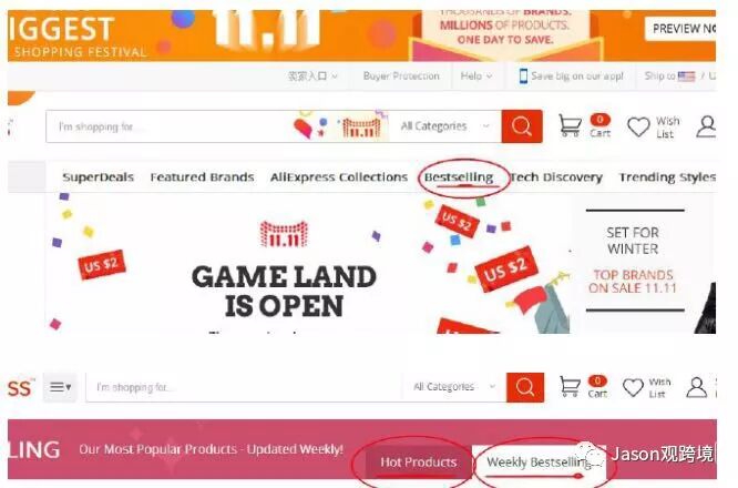 如果你是刚开始做电商,没有好的货源也不要着急,在速卖通的首页有Beatselling 的快捷入口,Weekly Selling 和Hot Products是整个速卖通平台的热销产品,这些产品在主流国家的认可度高,在选品的时候可以参考下。