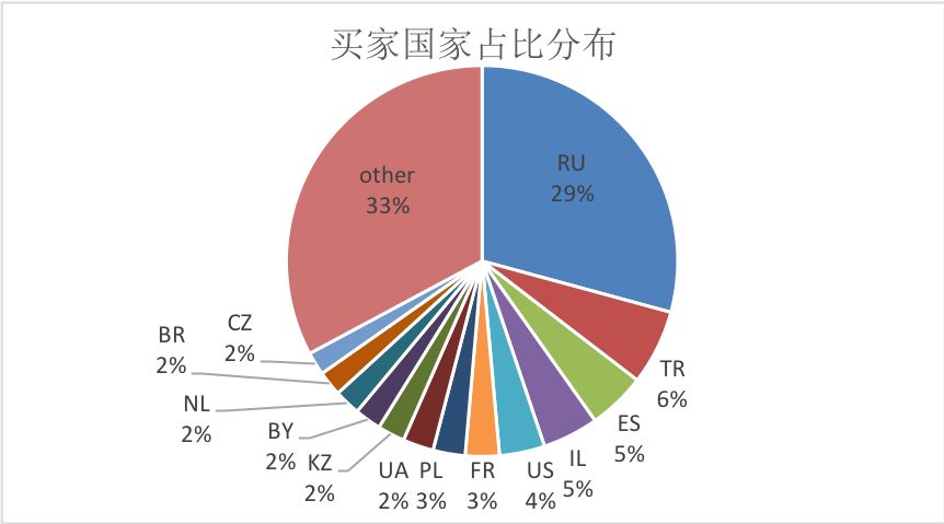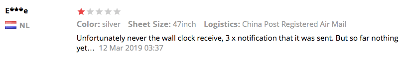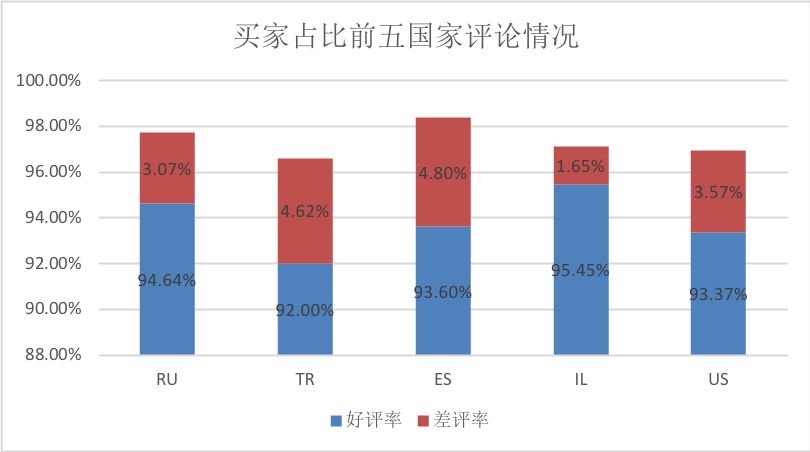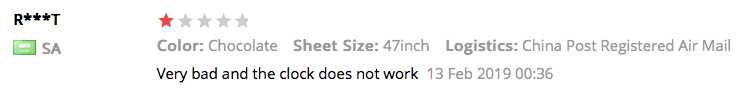 运用速卖通直通车关键词分析工具检索wall clocks,出现的有关词为clock wall , vintage wall clock , decor wall clock。可以看出他们的蓝海程度(蓝海程度=搜索热度/竞争度 ,数值越高,蓝海程度越高)分别为2552/544=4.14、2278/180=12.66、1170/436=2.68,其中clock wall和decor wall clock两个关键词的蓝海程度比较小,Vintage wall clock的蓝海程度较高。卖家在给商品命名的时候可以选取蓝海程度和搜索热度高的关键词来增加产品流量。 2. 速卖通上该行业的商品有6.15%可得到展示。 Wall clocks(挂钟)是速卖通的二级类目,该类目下共有产品77996个。由于速卖通仅显示前100页商品,因此该关键词下商品6.15%可得到展示。 3.近3年的全球搜索热度在每年11月、12月左右达到最大值,GB、AU、IR等国家的搜索热度居全球前三。 全球搜索热度:近3年来wall clocks搜索热度从每年6月开始上涨,11月、12月左右到达搜索最高峰,随后热度开始下跌,按此规律不断波动。 区域搜索热度:看出英国、澳大利亚、美国等国家对该产品的搜索热度高,卖家在营销时可以多加关注。 二 评价分析 评价分析的数据来源于样本(在速卖通中搜索wall clocks时前五页出现的所有商品),共有5235条评论数据。 1.评论星级分析 从下图可以看到,本次分析样本的五星好评有4359条,四星好评有576条,三星中评有117条,二星差评有57条,一星差评有126条。总体好评率为94.27%(五星+四星),差评率为3.38%(二星+一星)。该样本市场的行业好评率低,买家的满意度低,市场的改进空间很大。 下图为产品销量排名前五的产品的具体好评率与差评率。 可以看出,只有销量排名第二的产品差评率为3.61%,高于平均差评率3.38%,其余产品差评率皆低于平均水平。 样本产品词云如下图所示: 从图中可以看出“very”,“good”,“fast”,“thank”四词占据面积比较大,这反映买家比较满意产品的质量和运输速度。 我们将样本的差评筛选出来做成词云图: 通过词云图可以看出“very”、“receive”、“color”等词占据的面积比较大,浏览评论分析出买家想要退款、给予差评的原因是: (1)“came”“receive”等词反映出了产品的物流问题。买家因为收不到货物、物流运输速度慢、货物在运输过程中破损而要求退款等。 (2)“very”“quality”“bad”等词反映了产品的质量问题。产品做工粗糙、材料廉价,与图片描述不符。卖家在选品上要注重产品的质量。 (3)“color”反映了卖家发错货的问题,所发货品颜色与买家下单时挑选的颜色不一致。 2.买家来源分析 从买家国家占比图可以看到,排名前五的国家分别是 RU 、TR、ES、IL 和 US 。各位卖家可以针对这几个国家进行差异化营销,例如:设计相应语言的海报、具有国家特色的文案等以增强品牌好感。另外,从好评率与差评率的角度来看,买家最多的前五个国家中,IL的评论情况最可观,差评率仅为1.65%;ES差评率最高,为4.80%。 3.物流分析 从上面的物流占比图可以看出,卖家使用的物流方式主要有三种:China Post Registered Air Mail、ePacket 和AliExpress Standard Shipping,各物流方式的占比如上图所示。其中,China Post Registered Air Mail最受卖家欢迎,占比高达64%。AliExpress Standard Shipping的占比为25%,ePacket的占比为7%,三种物流加起来占比达到96%。 另外,针对不同国家,卖家会使用不同的物流方式,例如对于ES、IL、TR,卖家使用最多的是 China Post Registered Air Mail;而RU,ePacket的使用率最高;US前两种物流的使用比率都差不多。各位卖家可以以此为参考,优化自己的物流系统。 4.销售趋势及平均星级变化 上图反映了样本挂钟的销售趋势和行业平均星级。数据从2018年12月1日到2019年4月30日。可以看出梳子市场的评价星级波动,总体有下降趋势。该行业的平均星级数在近五个月来,在2019年1月达到最高为4.77, 2019年2月与4月最低,均为4.71。该行业的买家的满意度较低,市场产品存在着较大的改进空间。在图中也可以看出该市场的销量整体比较平均,在650上下变化。其中2019年1月与3月销量较高,达到700以上。 三 竞品分析 在这里,我们选取了外观设计和材质相似的两个产品进行分析。 1.总对比
