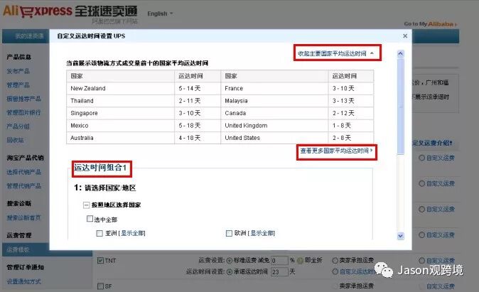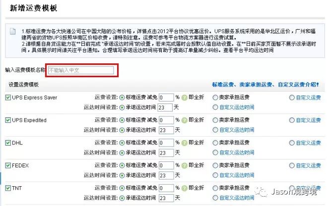 第二步,为该运费模板设置一个名字(不能输入中文),然后在以下页面选择物流方式、填写货物运达的时间和折扣: