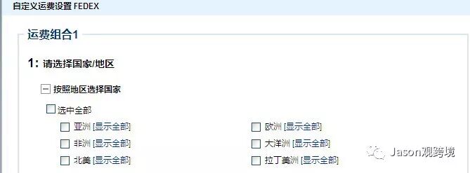 2、选择该运费组合包含的国家:你可将某些热门国家选为一个组合(如你想吸引美国买家,可选择美国,并将美国地区的运费设置为容易吸引买家下单的水平,如:卖家承担运费)。或按照区域选择国家:
