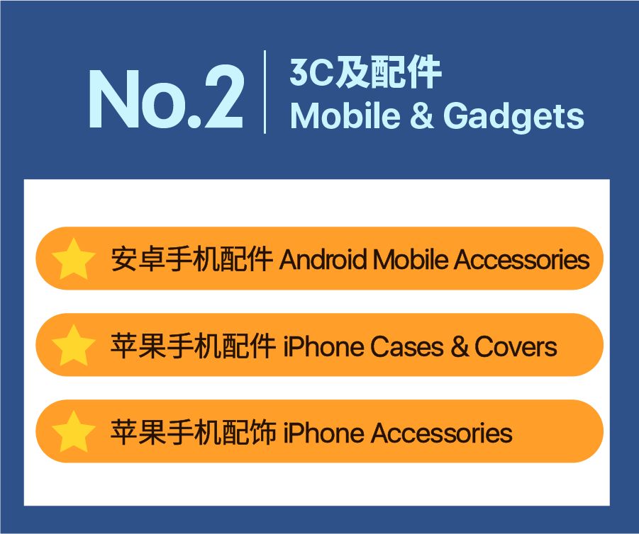 在3C配件类目中,安卓和苹果手机配件、苹果手机配饰这三个子类目订单月增长率在10%至20%之间,若卖家能多多上架最新潮流款式,便能领跑市场!