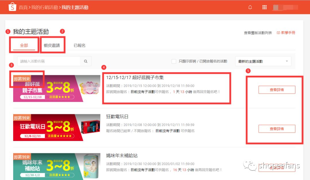 【我的主题活动】是设计给想要吸引更多订单的卖家,通过这项功能,可以报名商品参加即将开始的虾皮在线主题活动。