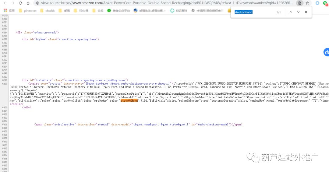 出现网页源代码之后,按Ctrl+F键,右上角会有一个搜索栏,输入stockonhand,就会查看到商品的库存数量了