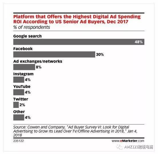 根据eMarketer的统计,30%的营销人员表示,Facebook广告的投资回报率高于其他平台,那剩余的70%呢?如下图数据所示: