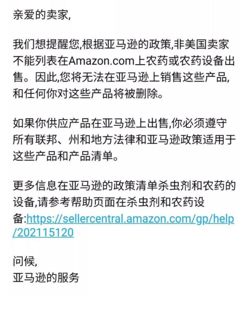 最近农药与相关产品被亚马逊下架、中国卖家频遭“误杀”的消息传得沸沸扬扬,很多卖家收到了这样一封邮件(某歌翻译版本):