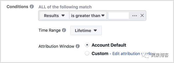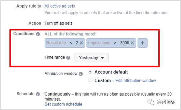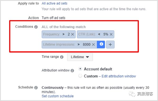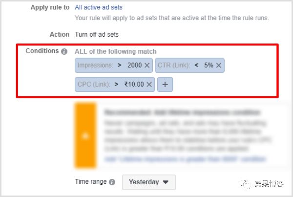 请记住,Facebook默认情况下建议使用8,000次终身展示。但是,由于此规则基于“昨天”的累积数据,因此使用2,000次展示而不是8,000次终身展示作为条件。