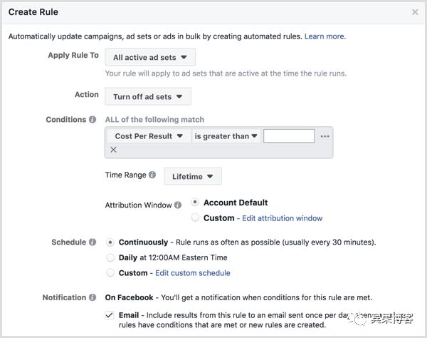 如果您选择Continuously,Facebook将尽可能经常检查自动规则条件,通常每30分钟一次。