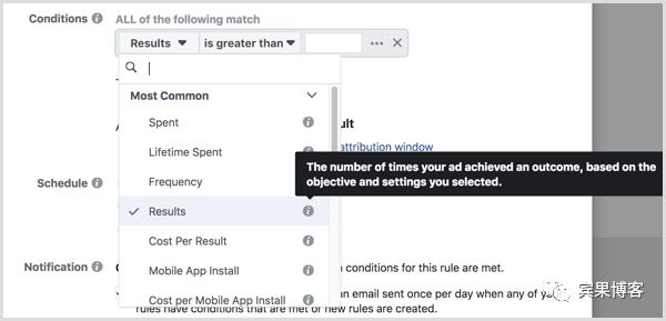 首先,从“结果”下拉列表中选择KPI指标。Facebook为您的规则条件提供了50多个可供选择的指标。首先列出最受欢迎的选项(花费,终身花费,频率,结果等)。如果您不确定从哪里开始,请从可带来重大性能提升的KPI开始,并可在多种情况下应用。