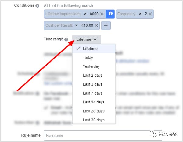 从“时间范围”下拉列表中,选择Facebook要查看的数据天数以评估规则条件。您可以根据生命周期数据,过去7天,14天等数据应用规则。