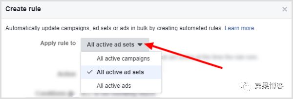 在“创建规则”对话框中,您可以找到配置自动规则的各种选项。所有这些选项一开始可能看起来令人生畏,所以我们将依次查看每个选项。首先,您需要选择要应用此规则的广告系列级别。您可以选择所有有效广告系列,所有有效广告集和所有有效广告。