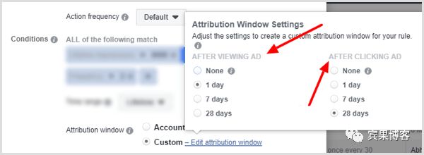归因窗口定义了Facebook如何将转化/结果归因于确定条件参数。默认设置是查看广告后1天和点击广告后28天。
