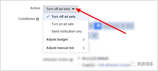 接下来,你选择满足规则条件时触发的行动。前两个选项是关闭或打开广告系列,广告集或广告。