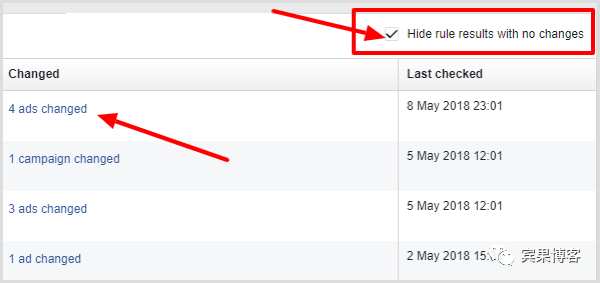 要过滤规则,请选中右上角的隐藏无变更规则结果复选框。然后,您将看到实际在帐户中进行更改的所有自动规则的列表。