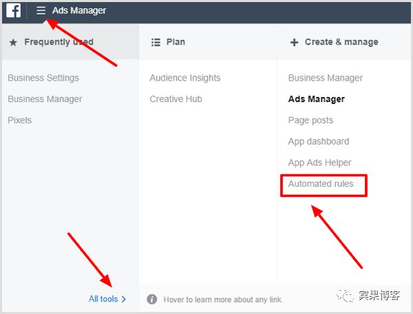要为所有有效广告系列,广告集或广告创建自动规则,请打开Facebook广告管理器,然后点击左上角的菜单图标(带有三行)。在弹出菜单中,将鼠标悬停在“所有工具”上,然后在“创建和管理”列下选择“自动规则”。