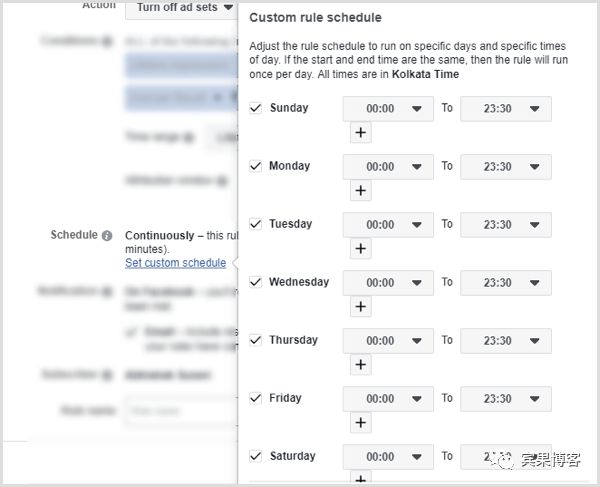 如果单击“设置自定义计划”,则可以定义希望Facebook检查规则的日期和时间。
